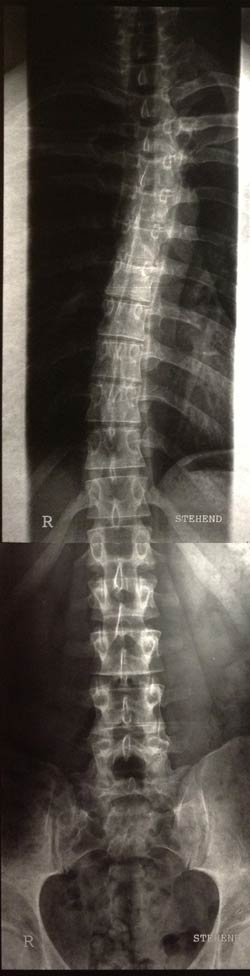 hab Röntgenbilder gefunden, die zeigen die Skoliose recht gut. Die Diagnose fidne ich leider nicht mehr. Da steht aber nicht viel mehr als Skoliose drauf. Ich erinnere mich. Soll cih die Bilde hier posten??