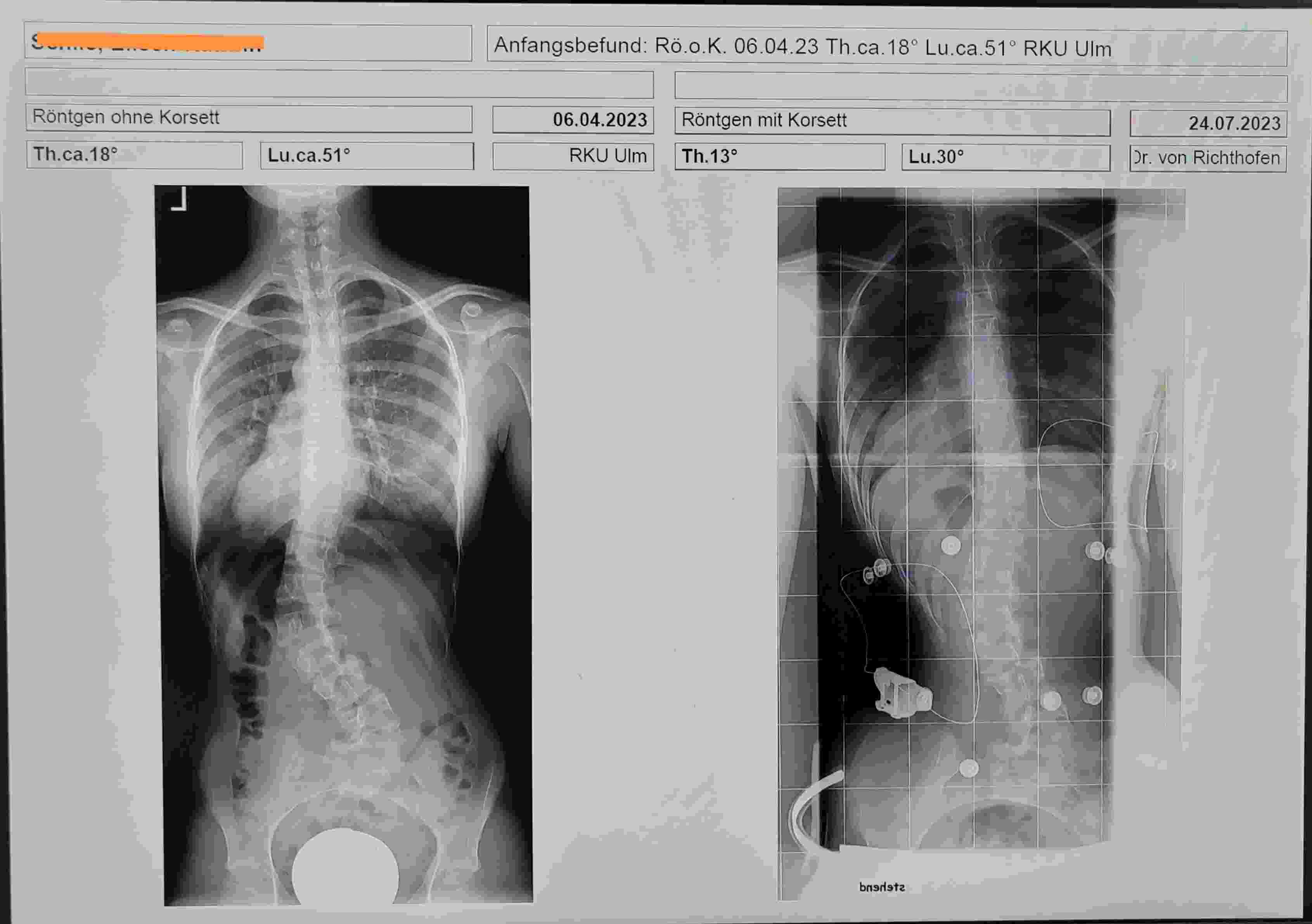 Ein Spezialist, der in eigener Praxis die Patienten über längere Zeit im Behandlungsversuch begleitet, ist schon etwas anderes, als ein Schroth- REHA Arzt. Und dieser Versuch hat doch gerade erst angefangen und ist doch jetzt schon mit einer lumbalen Korrektur von 21° ein guter Erfolg !