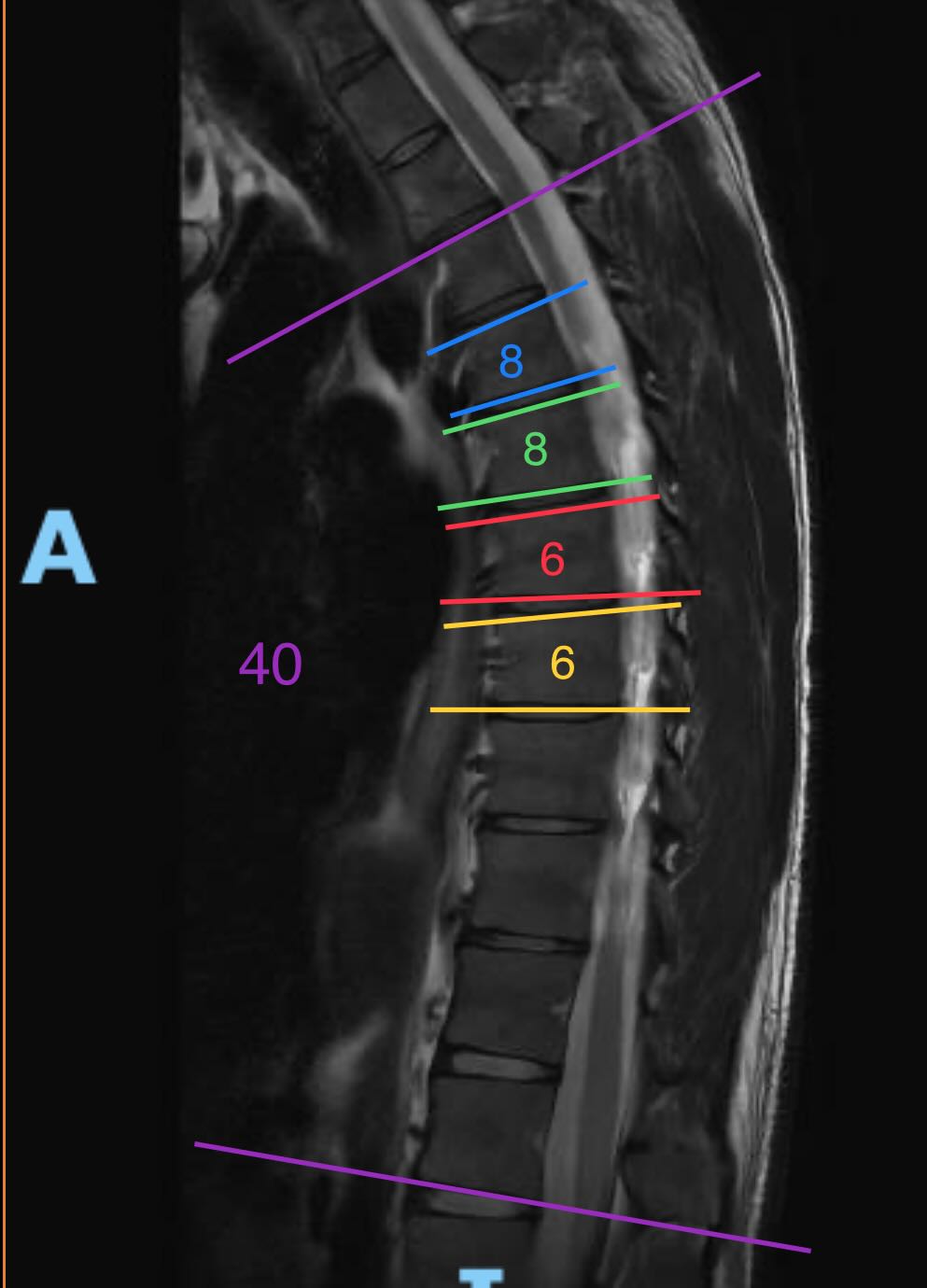 Ich finde es ja interessant, dass praktisch alle meine BWS-Wirbel keilförmig sind (letztes Bild), aber halt grade nicht stark genug, um das Scheuermann-Kriterium zu erfüllen. Das MRI hatte ja auch leichte Osteochondrose in der BWS festgestellt, was ebenfalls ein Scheuermann-Artefakt ist. Das an sich sollte ja eigentlich schon nicht normal sein, und erklärt auch den für mich sichtbaren kleinen Buckel, der auch von der Physio bestätigt wurde, und den ich selbst mit grösster Anstrengung nicht loswerde. Jegliche Selbsttests zur Hyperkyphose schlagen bei mir auch in milder Form an, wie z.B. grade an die Wand stehen so dass der Kopf die Wand berührt ohne hochzuschauen (was bei mir nicht geht).